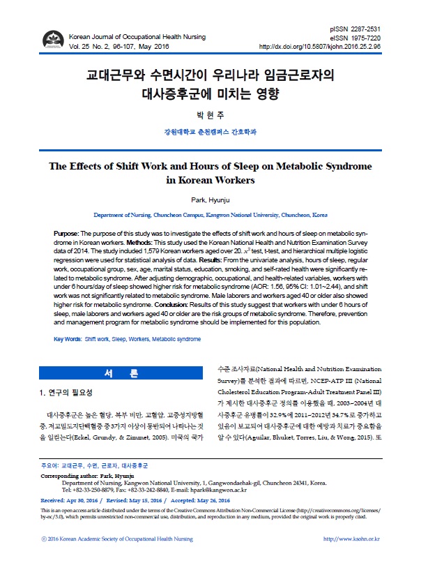 연구결과(교대근무와 수면시간이 우리나라 임금근로자의 대사증후군에 미치는 영향)는 한국직업건강간호학회의 학술지 최근호에 게재됐다.