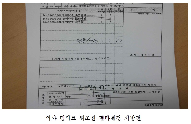 안산지청은 이어 "A씨 등은 성형외과 의원인 ㅁ의원이 환자들에게 주로 항생제, 진통제 처방을 하고 있어 부동문자로 인쇄된 의사 명의 처방전을 상시 보관 중인 것을 빌미로 범행을 계획한 것으로 나타났다"며 "보관 중인 처방전의 약품명을 지우고 '펜타젠정'을 써넣어 처방전을 위조한 다음 매수자들로부터 처방전료 1만원과 약값을 받는 등의 수법으로 불법 취득한 처방전 수익만 해도 2397만원에 이른다"고 말했다.