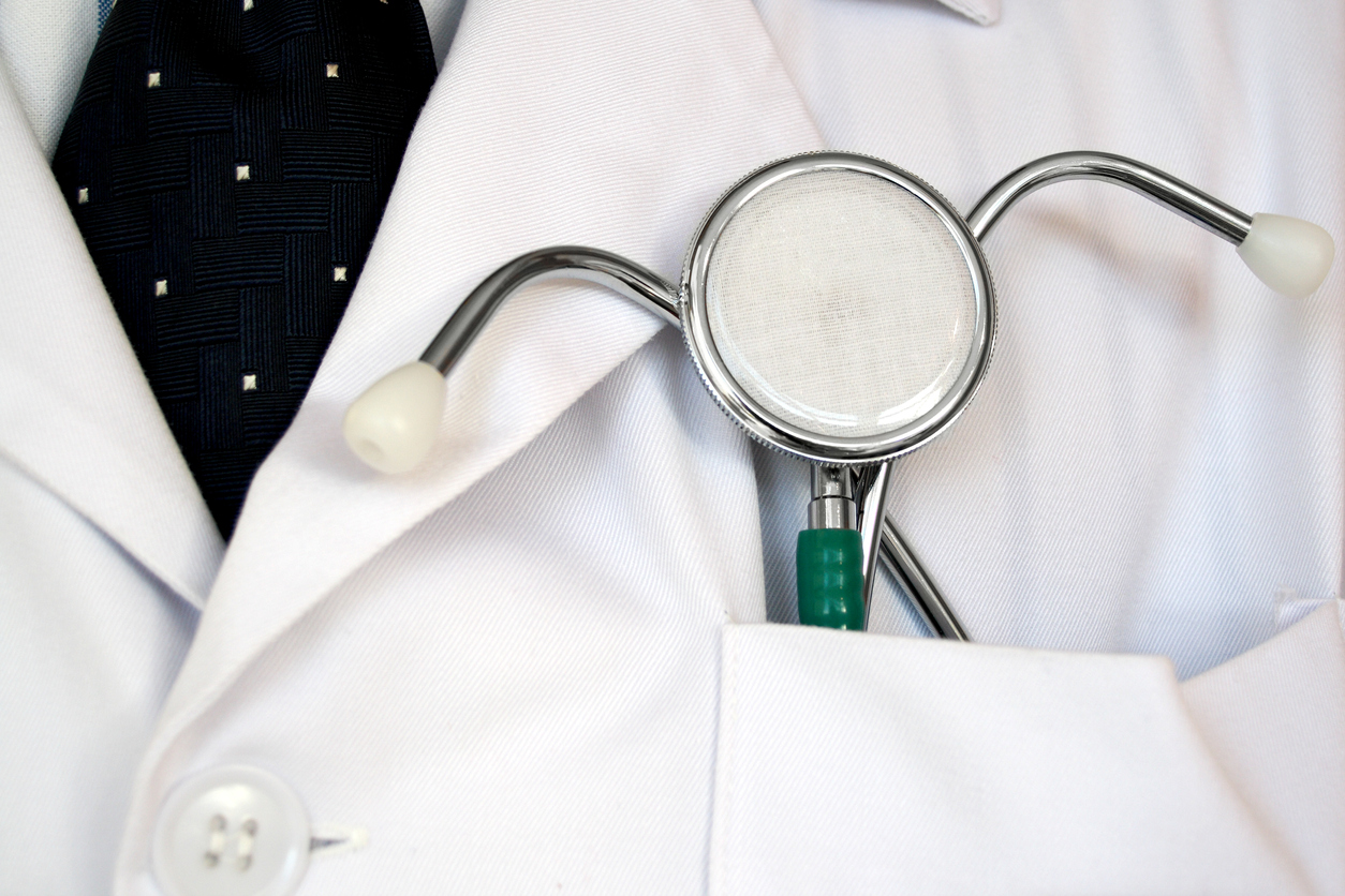Stethoscope in the pocket of the dressing-gown of the doctor prepared to examine the patient