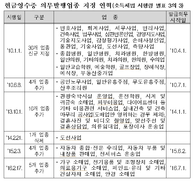 국세청, 가구·안경 등 현금영수증 의무발행업종 추가