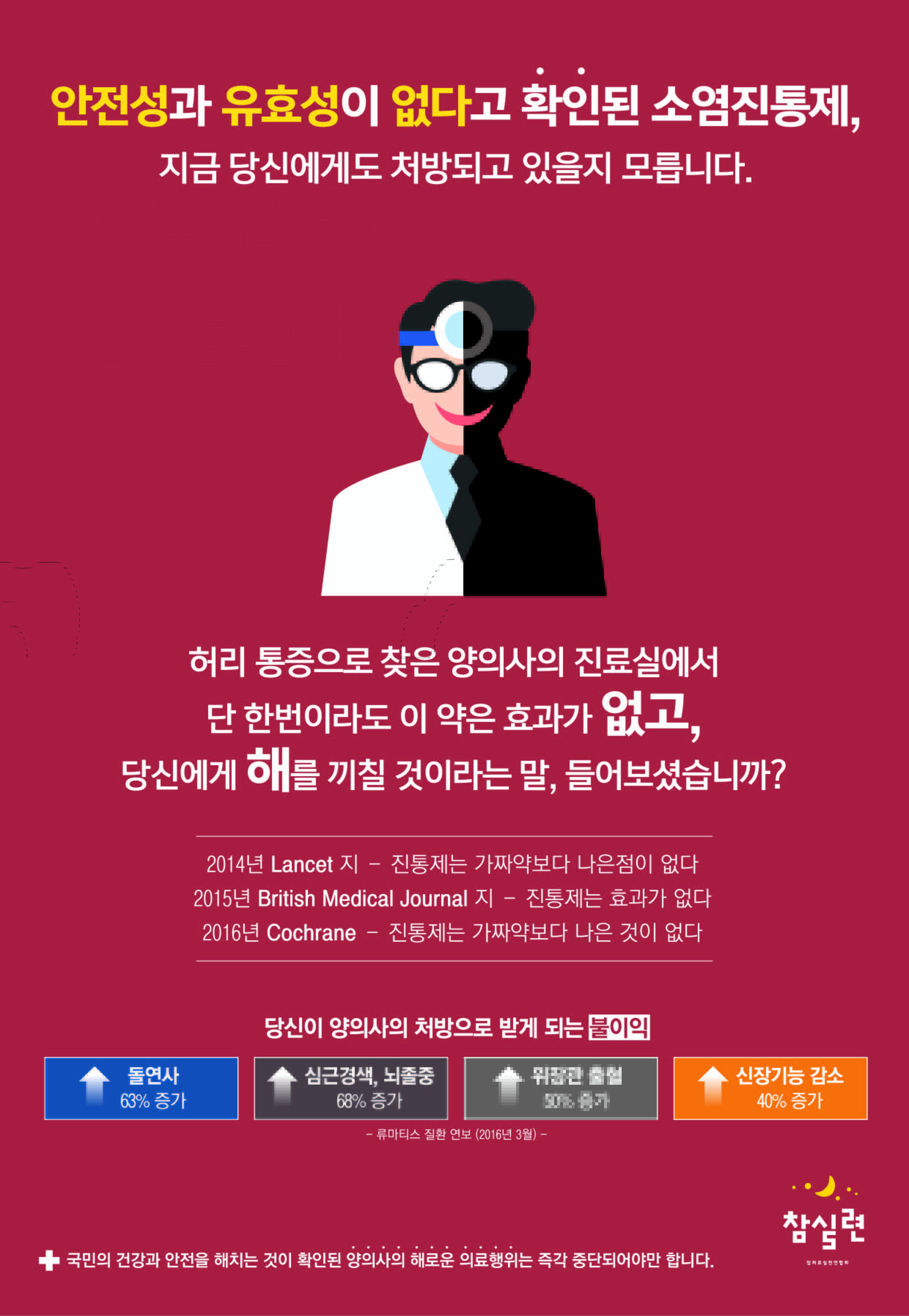 참실련은 광고를 통해 "안전성과 유효성이 없다고 확인된 소염진통제, 지금 당신에게도 처방되고 있을지 모릅니다"라며 "허리통증으로 찾은 양의사의 진료실에서 단 한번이라고 이 약은 효과가 없고, 당신에게 해를 끼칠 것이라는 말, 들어보셨습니까?"라고 되물었다.