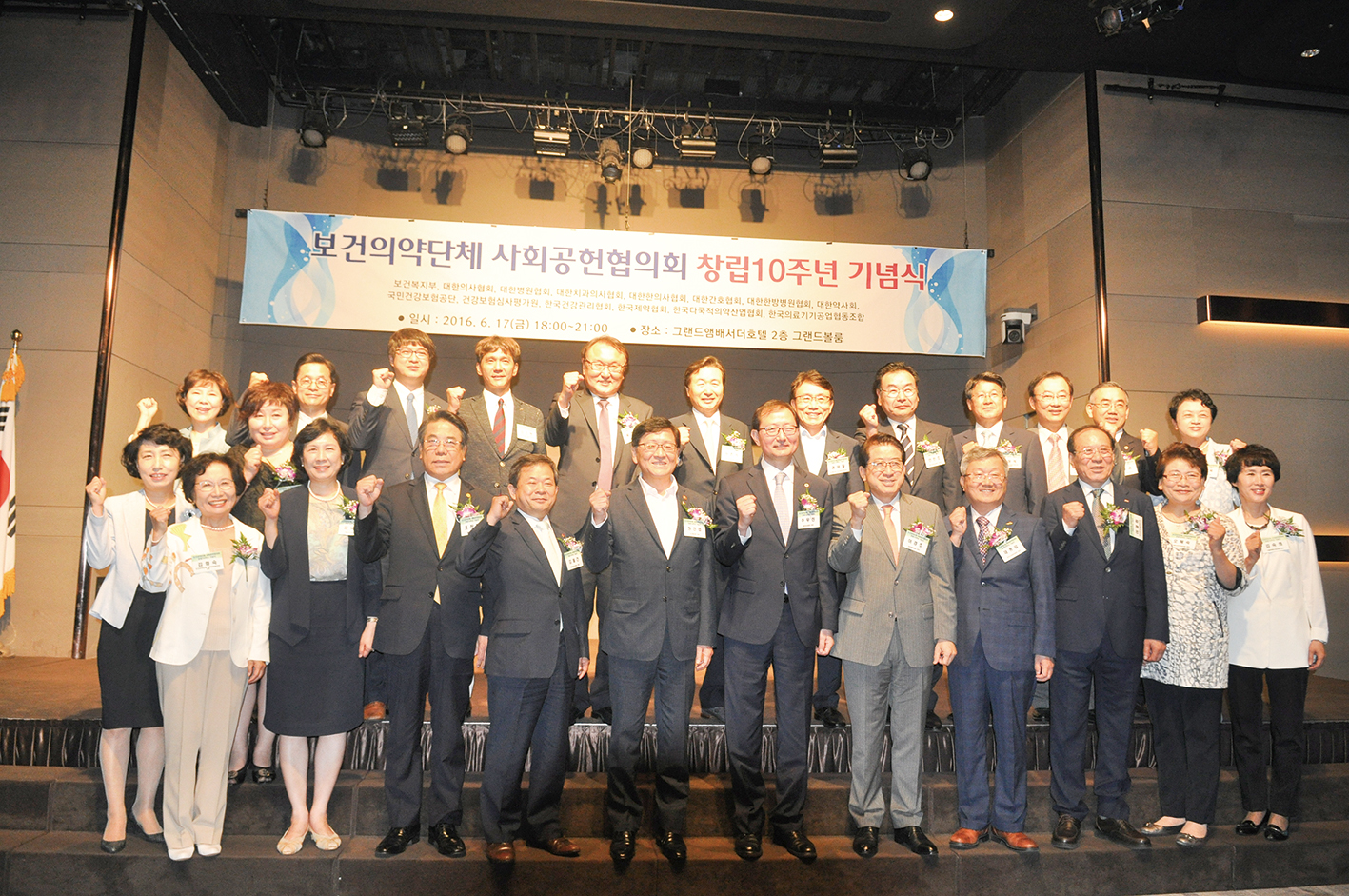 김태호 약무이사 등 복지부 장관 표창을 받은 수상자들이 지난 17일 앰배서더 호텔에서 열린 사공협 10주년 기념식에서 상을 받은 뒤 기념촬영을 하고 있다.