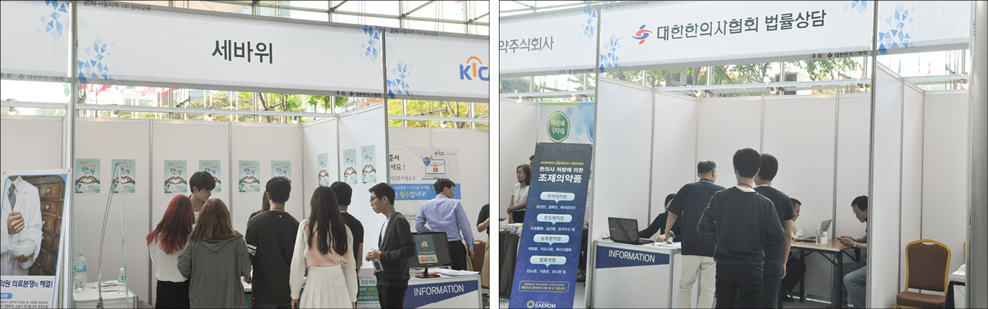 대한한의사협회 중앙회가 지난 22일 주최한 ‘2016년 서울지역 1차 보수교육’이 서울 삼성동 코엑스 그랜드볼룸홀에서 진행된 가운데 교육장 밖에 설치된 세바위 프로젝트 홍보부스와 법률상담 부스에서 회원들의 높은 관심을 받았다.