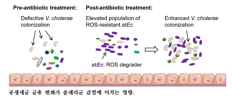 연구팀은 암피실린, 반코마이신, 스트렙토마이신, 클린다마이신 등의 광범위 항생제에 처리된 실험용 쥐가 대표적 병원성 세균 중 하나인 콜레라균에 의한 감염에 매우 취약해지는 것을 확인하고, 이러한 현상의 원인을 장내 공생세균과의 상호작용에 초점을 맞춰 연구를 진행했다.