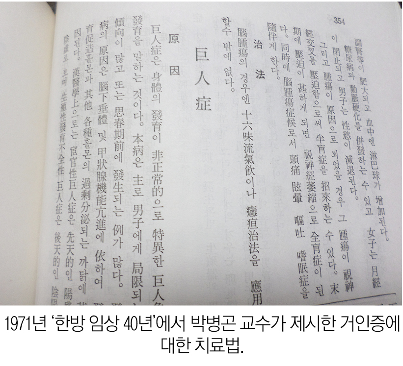 朴炳昆 敎授는 『한방 임상 40년』에서 거인증의 원인과 증상과 치법을 일목요연하게 정리하고 있다. 이 증상에 대한 한의학적 진단과 치료법을 제시하고 있는 것이다. 아래에 그 내용을 朴炳昆 敎授의 목소리로 정리한다.