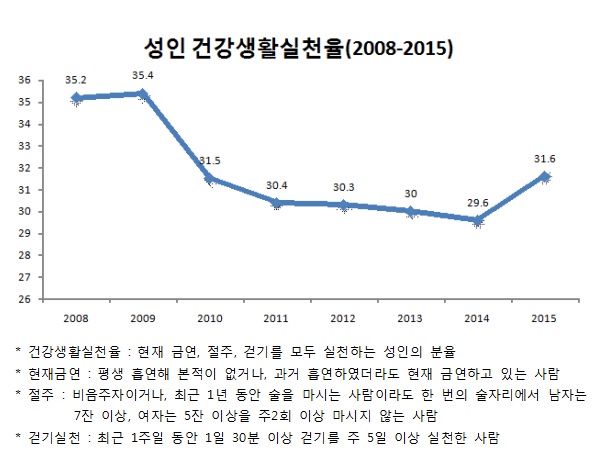 이 결과에 따르면 금연, 절주, 걷기 3가지 건강생활을 모두 실천하고 있는 성인은 31.6%로 전년 대비 소폭 증가한 것으로 나타났다. 이는 2008년(35.2%) 조사가 시작된 이후 2009년(35.4%)부터 2014년(29.6%)까지 최근 6년간 계속 감소하다 지난해 처음으로 전년 대비 2%p 증가한 수치다.