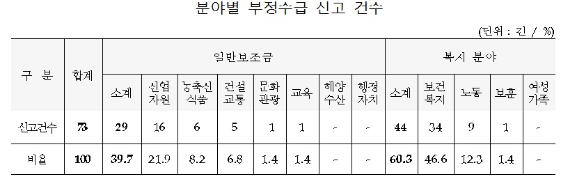 공공재정 부정수급 신고, 보건복지 분야 '최다'