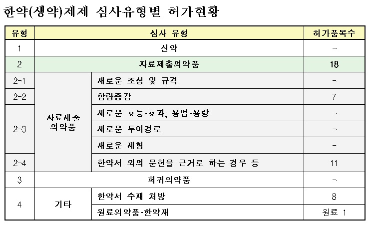 의약품 종류별 허가현황에 따르면 지난해 한약(생약)제제는 27품목이 허가됐으며, 이 가운데 완제의약품은 26품목(전문의약품 6품목·일반의약품 20품목)이고, 1품목은 원료의약품이었다.