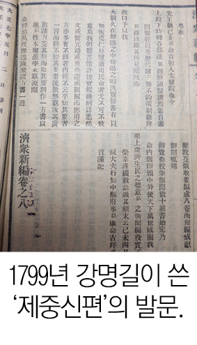 [한의신문]康命吉(1737〜1801)은 조선 문화의 황금기인 영조와 정조년간에 御醫로 활동하면서 뛰어난 의술로 당대 최고의 의사로 이름을 떨친 인물이다. 영조 44년인 1768년에 의과고시에 합격해 내의원에 들어온 후 정조대까지 의술과 학식으로 이름을 떨쳤고 이러한 능력을 인정받아 1794년에는 首醫의 위치까지 오르게 되었다. 그는 1799년 왕명에 따라 『濟衆新編』이라는 의서를 간행하는데, 이 책은 『東醫寶鑑』의 단점을 극복하고 활용도가 높은 의서를 만들고자 하는 정조대왕의 의지의 반영으로서 康命吉은 이를 잘 수행해 냈다. 康命吉 자신이 지은 발문에는 다음과 같이 서술하고 있다.