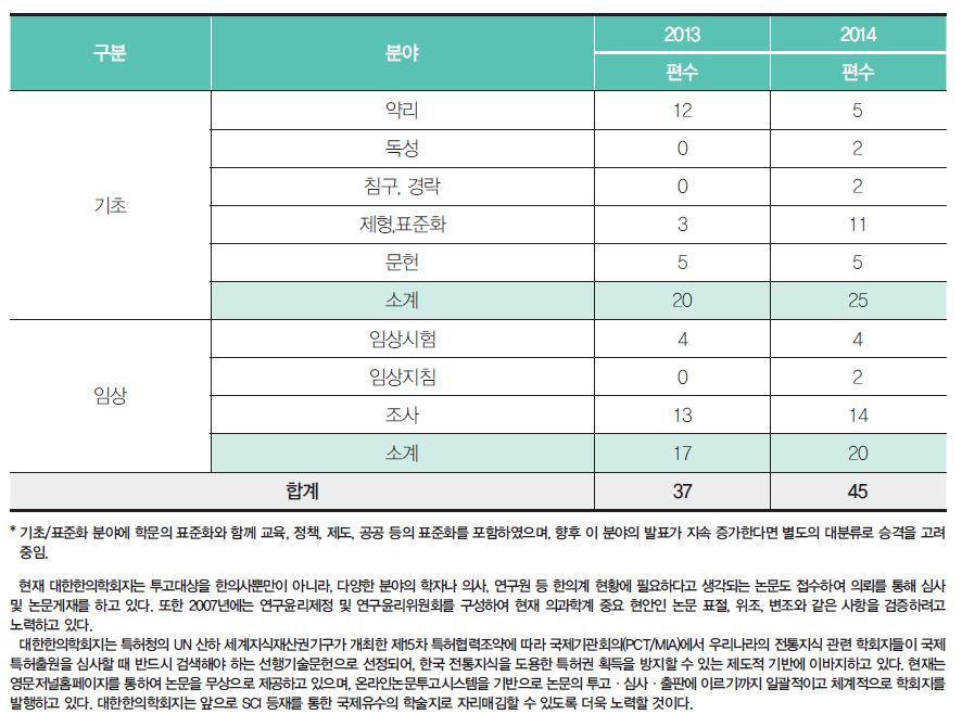 논문을 분야별로 살펴보면 기초논문이 총 25편이고 임상논문이 20편으로 기초와 임상논문이 거의 비슷하게 발표됐다. 기초 논문의 경우 과거에는 약리, 독성, 침구/경락, 문헌 등이 주를 이뤘지만 2014년에는 학문, 정책, 제도, 교육 등의 표준화 연구가 증가했다. 이는 각기 분과학회지의 전문 분야를 넘어 거시적인 차원에서의 연구가 확장되는 과정으로 해석되고 있다.