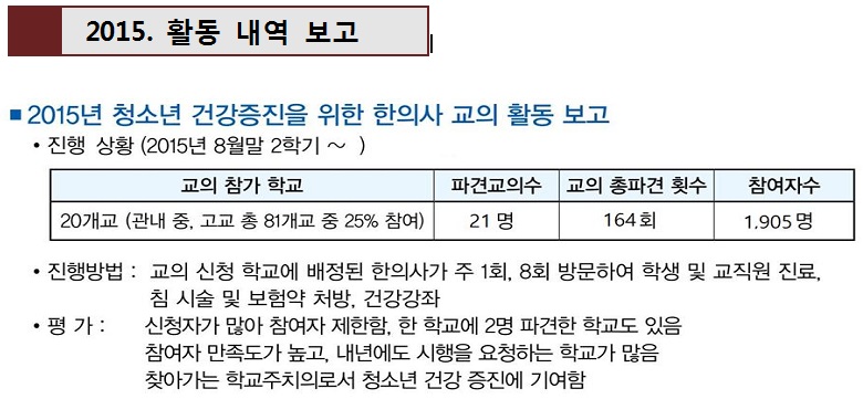 청소년 건강증진을 위한 한의사 교의활동은 교의를 신청한 학교에 배정된 한의사가 학교를 방문해 학생 및 교직원 진료, 침 시술 및 보험약 처방, 건강강좌 등을 실시하는 것을 말한다.