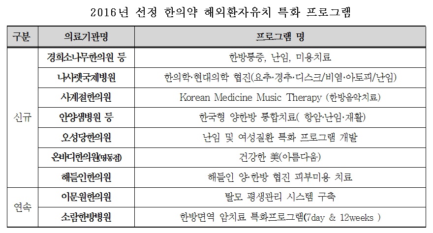 신규 선정 기관과 프로그램은 △경희소나무한의원, 서울경희한의원, 단아안청담한의원 컨소시움(문화의료체험, KIMCHI의 3色한 접근) : 한방통증, 난임, 미용치료 프로그램 개발 △나사렛국제병원(나사렛국제병원 한의학 현대의학 협진시장 차별화 전략) : 요추, 경추, 디스크·비염, 아토피·난임 등 한의학과 현대의학 협진 △사계절한의원(한방음악치료) : 한방음악치료와 관광 결합의 고부가가치 특화 프로그램 △안양샘병원(해외환자유치국가 다변화 및 활성화를 위한 한국형 양·한방 통합치료 시스템 구축) : 항암치료, 난임치료, 재활치료 등에 대한 양․한방 통합 치료시스템 구축 △오성당한의원(일본 난임 및 여성질환 특화 프로그램) : 일본인을 대상으로 난임 및 불임 치료 특화 프로그램 개발 △온바디한의원 명동점(건강한 아름다움) : 한방미용치료 △해들인한의원, 해들인의원 컨소시움(해들인 한․양방협진으로 한의약 해외환자 유치) : 한방 여드름치료, 주름 개선 프로그램이다.