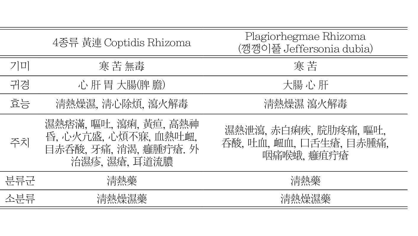 위의 도표에서 보듯이 4종류 黃連 Coptidis Rhizoma과 깽깽이풀 Jeffersonia dubia의 뿌리인 毛黃連은 효능면에서 유사하게 기록돼 있다. 하지만 기원식물과 기타사항을 참고하면,