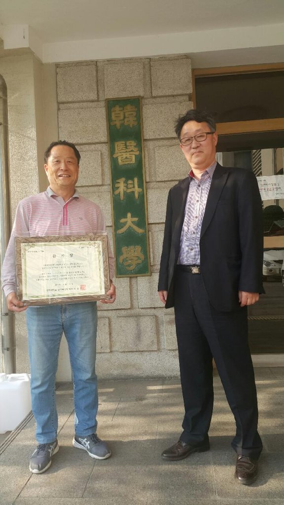 IMG_4821 (◇한현우씨(좌측)와 김남일 경희한의대 학장이 발전기금 기탁 후 기념촬영을 하고 있다.)