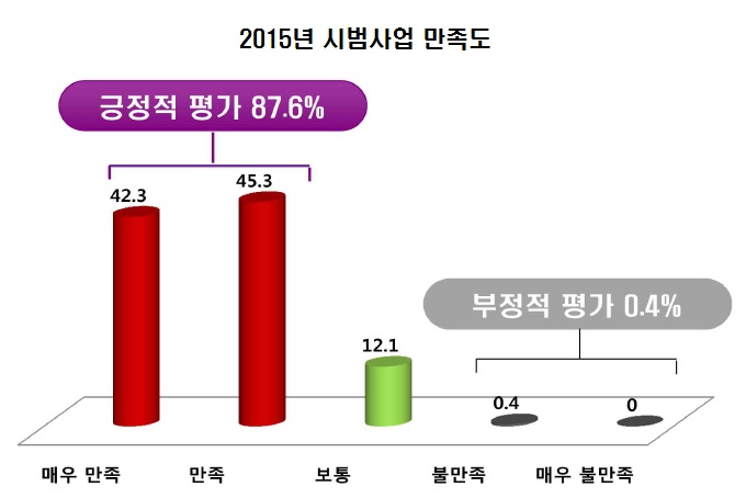 2015년 시범사업에 대한 만족도는 87.6%(매우만족 42.3%, 만족 45.3%)로 매우 높았다. 평가결과 한의약 임신부 교육 프로그램이 임신 관련 건강관리 지식점수를 높이는 효과가 있었으며 육아인식도를 개선하는데도 유의한 영향을 주는 것으로 나타났다.