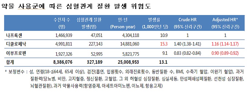 디클로페낙의 경우 심혈관질환 발생 위험이 알려져 있는 점을 고려해 디클로페낙과 나프록센을 사용한 환자군에서의 심혈관계 질환 발생 위험도를 비교한 결과 나프록센의 발생위험을 1로 보았을 때 디클로페낙 사용 환자군에서의 위험은 1.16배로 높게 나타났다.