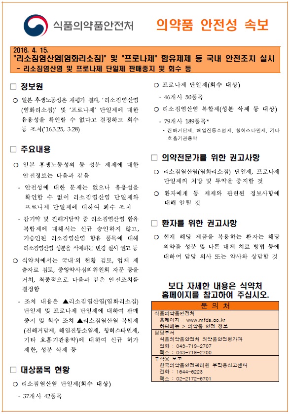 이번 조치는 일본 후생노동성(이하 노동성)이 지난 3월 염화리소짐 단일제와 프로나제 단일제에 대한 회수조치를 결정한 것을 고려한 것으로, 지난 14일 개최된 식약처 중앙약사심의위원회에서는 이들 제제에 대한 판매 중지 및 회수 타당성, 신규 허가 제한, 성분 삭제 등 조치의 타당성에 대한 심의 후 결정됐다.