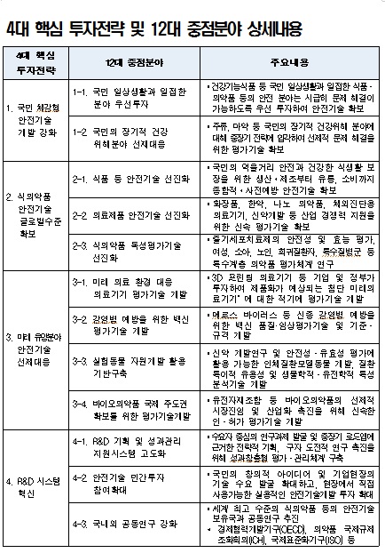 이번 기본계획은 국민이 안전을 넘어 안심할 수 있도록 사전예방적 안전체계를 강화하고 첨단 의료제품의 해외 신시장 창출 견인을 위한 신속한 인·허가 체계 기반 조성을 목표로 △국민 체감형 안전기술 개발 강화 △식품·의약품 안전기술 글로벌 수준 확보 △미래 유망 분야 안전기술 선제 대응 △연구개발(R&D) 시스템 혁신 등의 4대 핵심투자전략을 담고 있다.