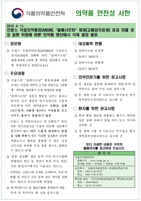 [한의신문=강환웅 기자]식품의약품안전처(이하 식약처)는 고혈압 치료제로 사용되는 성분인 '올메사르탄' 함유제제에 대해 최근 프랑스 국립의약품청(이하 ANSM)이 효과 미흡 및 장질환 발생 위험성 등으로 인해 의약품 명단에서 삭제할 것이라고 발표함에 따라 국내 의약전문가 및 소비자 단체 등에 안전성 서한을 배포한다고 11일 밝혔다.
