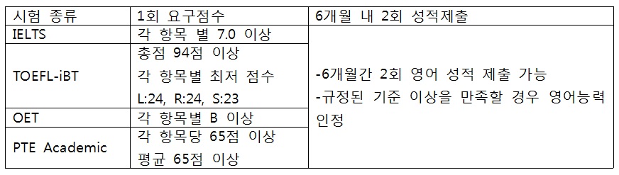 이 외에도 일정한 영어점수나 영어 사용 국가에서의 유학 사실을 증명할 수 있어야 한다. 영어 점수의 경우 지난 해 7월부터 아이엘츠(IELTS), 토플 아이비티(TOEFL-iBT), PTE 영어시험(PTE Academic), 의료영어시험(OET) 에서 1회 일정 점수 이상 맞도록 변경됐다. 일정 점수를 받지 못하더라도 2차로 6개월 내에 다시 시험을 치뤄서 기준을 충족시키면 된다.