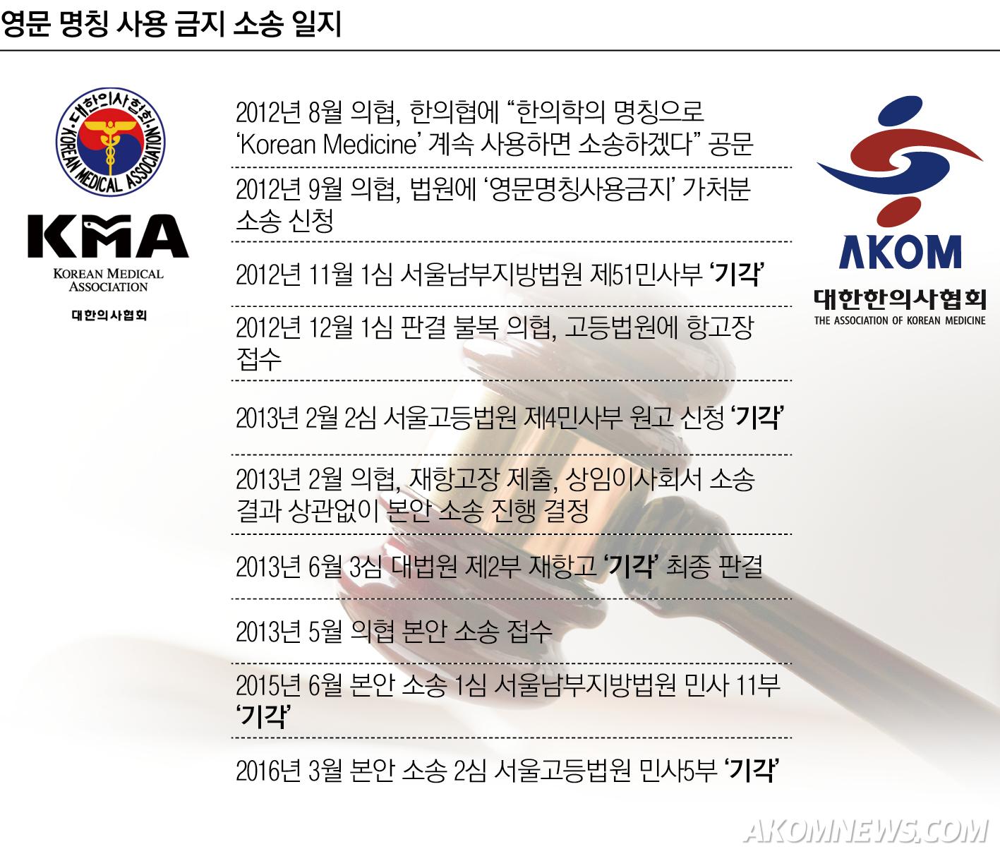 지금까지 의협은 한의협을 상대로 영문명칭 사용 금지 가처분 신청 및 본안소송까지 총 5번의 재판을 진행했지만 모든 판결에서 패소했음에도 불구하고, 또 다시 대법원 상고를 결정한 것은 대한민국 국민이라면 누구나 존중해야 하는 사법부의 판단마저 무시하는 태도로 눈살을 찌푸리게 하고 있다.