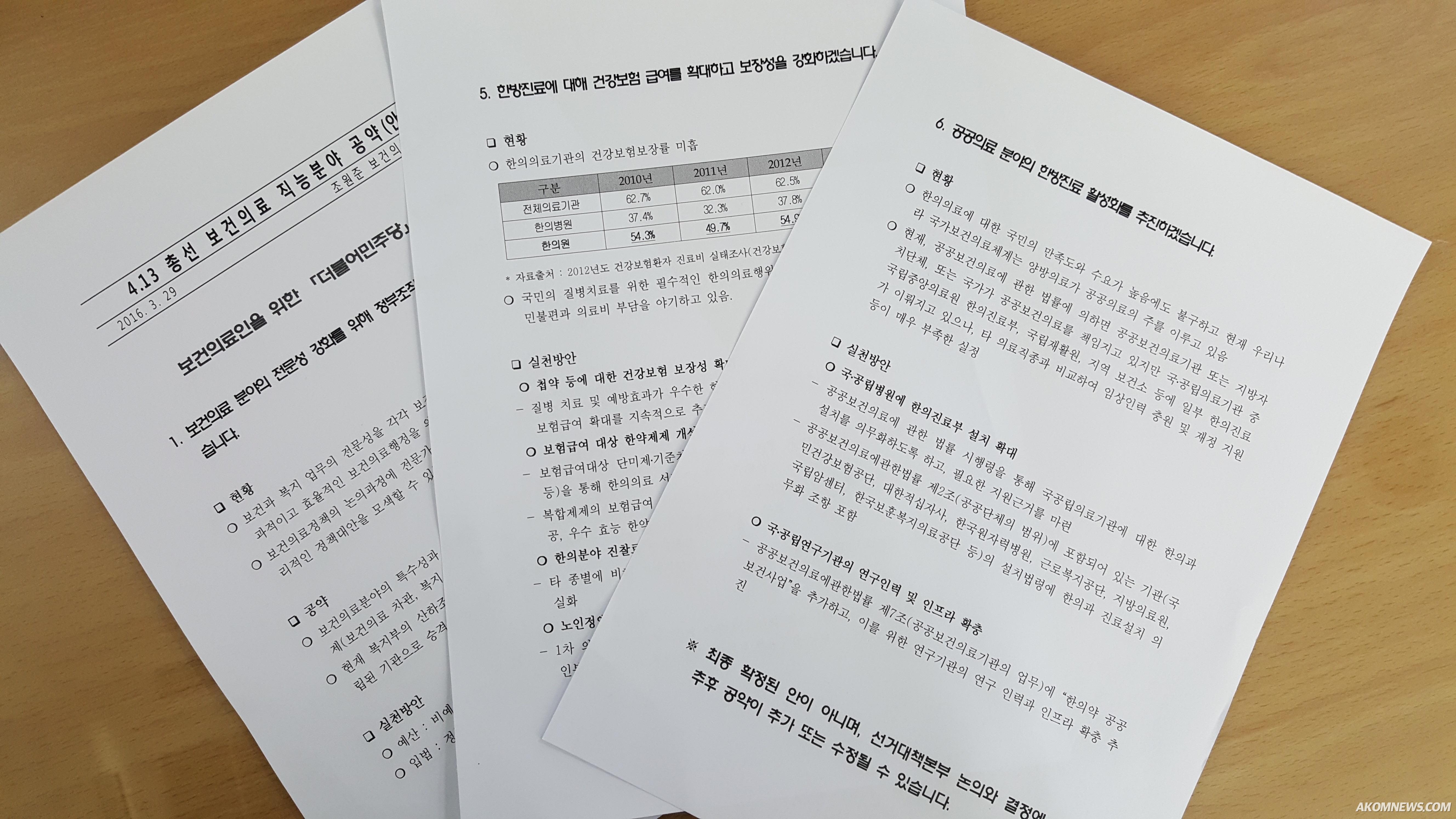 더민주당은 '공공의료 분야의 한방진료 활성화를 추진하겠다'고도 했다.
