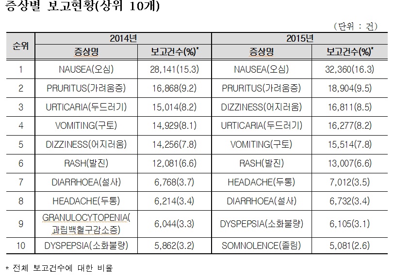 또한 증상별로는 '오심(헛구역질)'이 3만 2360건(16.3%)으로 가장 많았으며, '가려움증' 1만 8904건(9.5%), '어지러움' 1만 6811건(8.5%), '두드러기' 1만 6277(8.2%), '구토' 1만 5514건(7.8%) 등이 뒤를 이었다.
