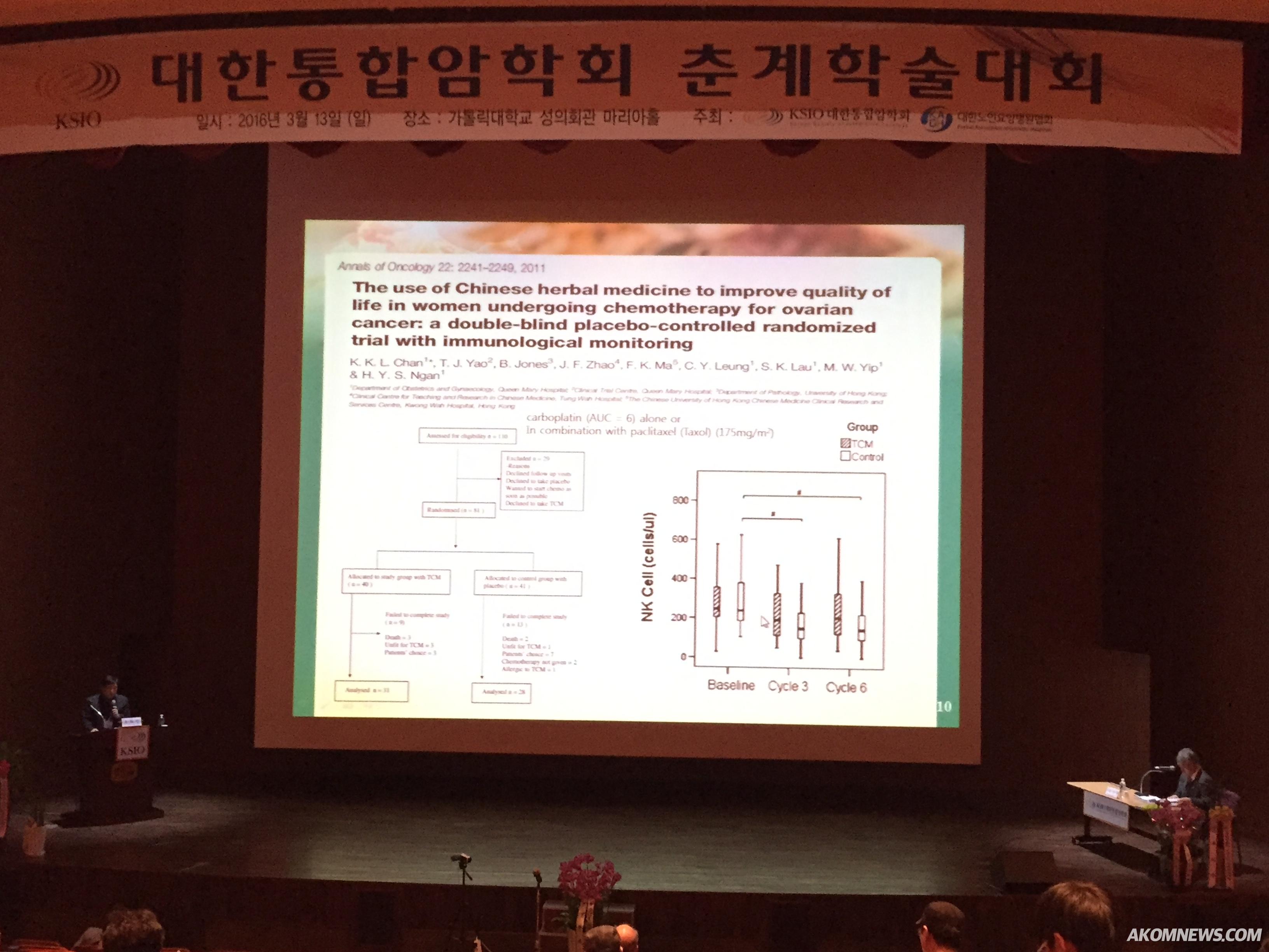 특히 한약이 비소세포폐암의 치료에 미치는 영향을 평가하기 위해 DBM, Medline, TCMLARS, Embase, Cochrane, CCRCT database 등을 통해 1,305개 논문과 2,815명의 환자를 분석한 34개 RCT를 분석한 결과 12개 연구에서는 1년 내 사망률을 줄였고 30개 연구에서는 암 치료 반응이 좋았으며 ‘진후강’에 대해 2개 연구에서는 2년 내 사망률을 줄이고 3개 연구에서는 암 치료반응을 호전시켰으며 ‘애디주사’는 4개 연구에서 karnofsky 점수를 호전시킨 것으로 나타났다고 소개했다.