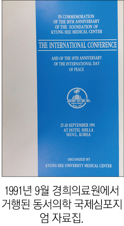 [한의신문]1991년 9월 27일부터 28일까지 서울 신라호텔에서는 경희의료원 주최로 동서의학 국제심포지엄이 거행된다. 본 심포지엄은 경희의료원 개원 20주년 및 세계평화의 날 10주년 기념행사로 거행되었다. 이 때 배포된 자료집은 현재 경희대 한의대 의사학교실에서 보관하고 있다. 이 자료집은 표지는 영어로, 내용은 영어와 한국어를 병용하여 작성되어 있다.