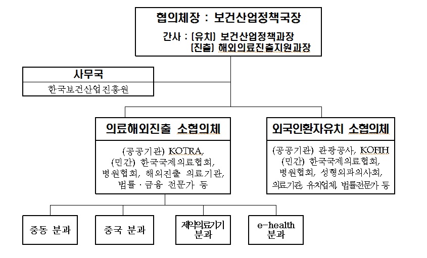 협의체는 대한한방병원협회, 대한병원협회, 한국국제의료협회, 대한치과의사협회, 대한성형외과의사회 등 관련 협회 이외에도 외국인환자 유치 실적(30위 이내) 및 의료시스템 해외진출 프로젝트 지원사업 신청(3회 이상), 지역 등을 고려해 선정한 10여개의 의료기관과 유치업체 등도 위원으로 참여토록 하는 등 논의의 폭을 넓히는 한편 이외에도 한국보건산업진흥원, 한국관광공사, KOTRA, 국제보건의료재단 등의 공공기관이 참여해 보건의료산업 세계화 실현을 위한 관계기관간 협업을 촉진하고 지원역량을 결집했다.