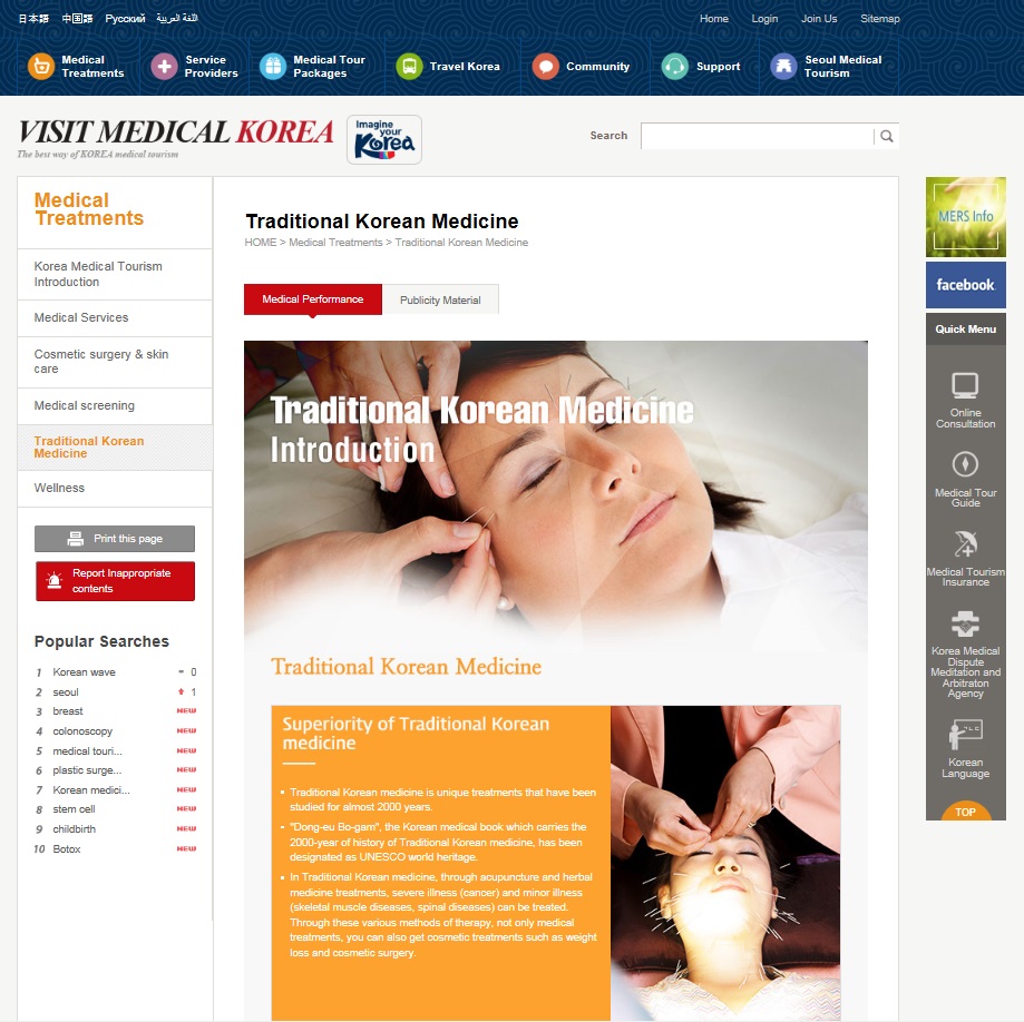 또 의료관광 단계별 체크리스트, 성형수술 전후 유의사항, 의료분쟁정절차 안내, 한국보건산업진흥원 메디컬 콜센터 정보 등 유용한 의료관광 TIP도 확인할 수 있다.