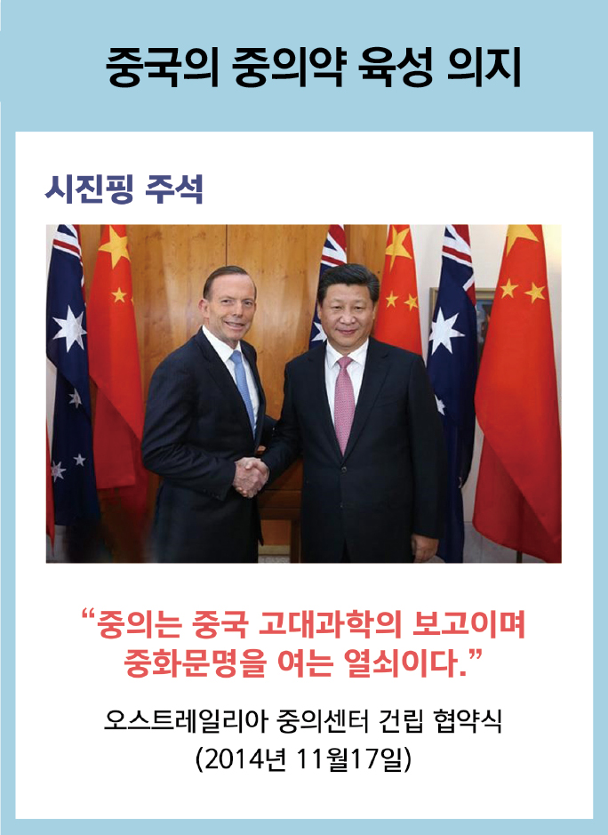 이같은 헌법 정신에 따라 중국의 역대 정치 지도자들은 중의약 육성 발전을 위해 지속적인 관심과 투자를 아끼지 않았다.