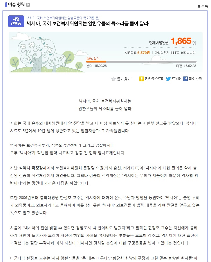 9월28일 백혈병어린이보호자회(회장 김영옥), 대한암환우협회(회장 이정호), 암환우보호자회(회장 이병관)는 이슈청원사이트에서 국내 유수의 대학병원에서 암 진단을 받고 더 이상 치료하지 못 한다는 시한부 선고를 받았으나 ‘넥시아’ 치료로 5년에서 10년 넘게 생존하고 있는 암환자들과 그 가족들이라고 자신들을 소개한 후 10년 가까이 넥시아를 둘러싼 말도 안 되는 황당한 주장들에 시달려 분통이 터질 지경이라고 심정을 토로했다.