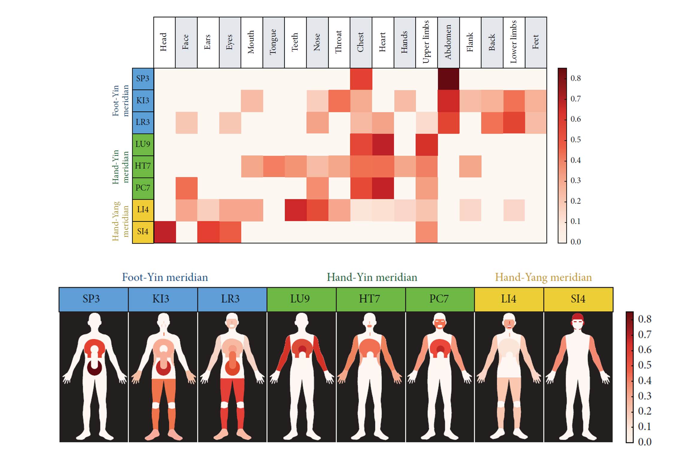 데이터 마이닝 방법을 통해 주요 원혈이 치료할 수 있는 주치 증상의 정보를 객관적 수치를 통해 제시했는데 족삼음경의 원혈 (태백, 태계, 태충)이 주치하는 부위는 주로 복부와 하지 부위에 위치하고, 수삼음경의 원혈 (태연, 신문, 대릉)이 주치하는 부위는 주로 흉부와 상지 부위에 위치했다.