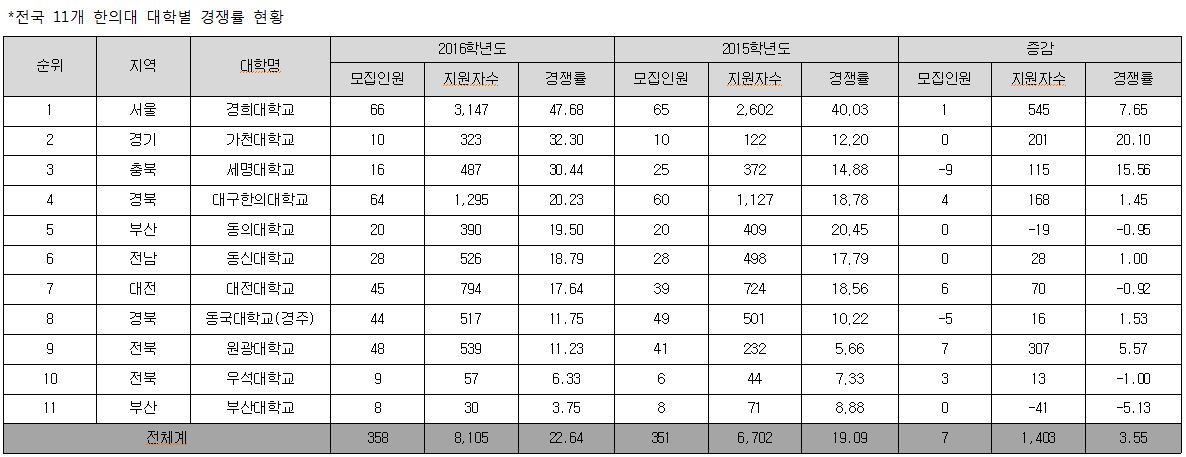 2016학년도 의학계열 수시전형 최종 마감 결과 전국 한의대 11개 대학 기준 한의예과 경쟁률이 22.64(▲3.55)대 1을 기록해 전년(19.09) 대비 소폭 상승했다.