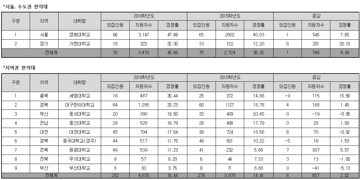 2016년도 한의대 총 11개 대학 평균 경쟁률은 전년대비 3.55포인트 상승했다. 지역 소재 한의대 9개 대학 지역인재전형 평균 경쟁률도 9.36으로 전년도보다 1.26포인트 상승했다.