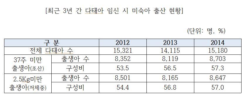 이에 따른 다태아 출산도 지난 2012년 15,321명, 2013년 14,115명, 2014년 15,180명으로 매년 증가하고 있다.