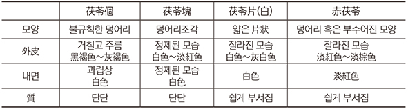 전통적인 유통시장의 분류에서 茯苓 전체 덩어리를 기준으로 보아 바깥쪽에서 안쪽으로 설명하면, 皮部인 茯苓皮, 증숙발효단계에 있는 붉은 색을 띠는 가루 부분인 赤茯苓, 증숙이 거의 끝나 흰색을 띠는 가루 부분인 白茯苓, 완전 증숙으로 수분이 거의 상실된 茯神, 그리고 죽은 뿌리 부분인 茯神木이 자리잡게 된다. 다시 말하면 증숙발효단계에서는 전체가 안쪽까지 붉은색을 띠는 赤茯苓의 모양도 있을 수 있으며, 완전히 증숙되어 치밀한 흰색조직인 茯神으로 되어 있기도 하는 등 모양은 다양할 수 있는 것이다. 전체적으로 보면 증숙·발효·탈수의 정도 및 시기에 따른 한약재의 이름으로 정리된다.