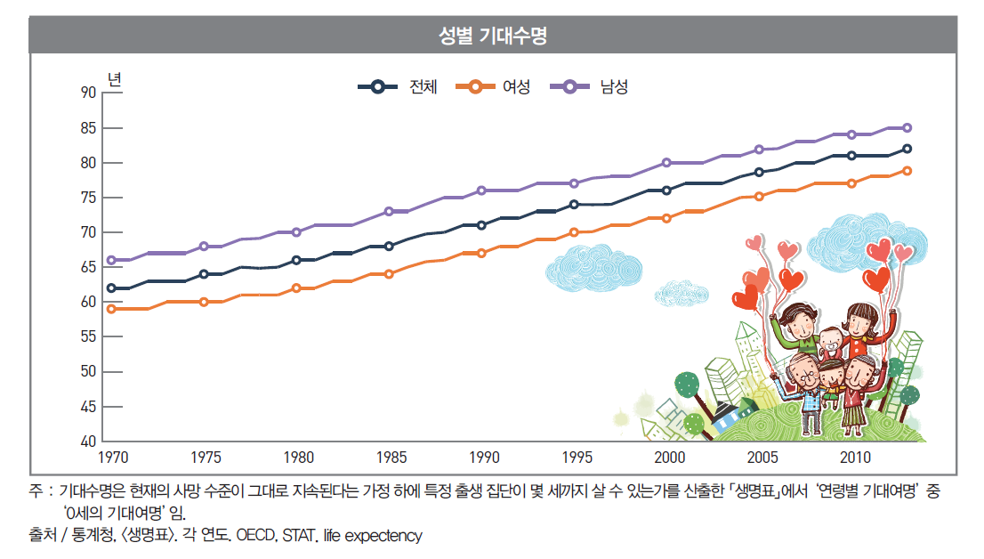 1970년의 남녀 평균수명 차이는 남성이 58.7세, 여성이 65.6세로 6.9세 가량이었다. 평균 기대수명이 약 20세 증가한 43년 후에도 그 차이는 좁혀지지 않았는데, 2013년 한국인 남성 수명이 78.5세, 여성 수명이 85.1세로 나타나 남녀 간의 수명은 여전히 6.6세의 격차를 보였다.