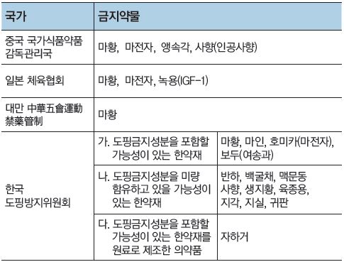 다음은 중국, 일본, 대만, 한국의 도핑관련 한약금지약물 비교표이다. 이를 보면 우리나라 KADA의 목록 선정이 과학적인 근거 없이 과다한 규제를 행하고 있음을 알 수 있다. 중국은 마황·마전자·앵속각·사향(인공사향)을, 일본은 마황·마전자·녹용(IGF-1)을, 대만은 마황 하나만 금지약물로 지정하고 있을 뿐이다.
