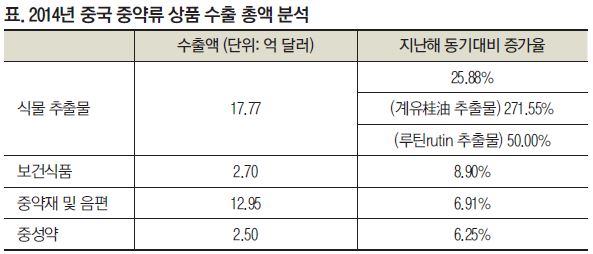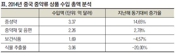 현재 중국의 중약류 상품 시장은 급속 성장기를 지나 성장 안정기에 들어선 것으로 보인다. 2014년도 중국 중약류 상품 수출입 증가율은 9.79%로 2013년 수출입 증가율 25.10%에 비해 하락세를 나타내었다.