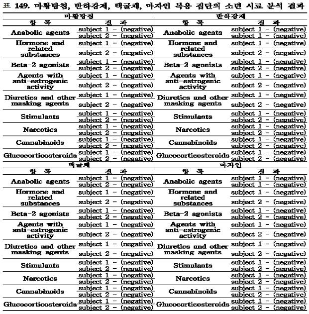 또한 도핑 금지성분이 포함된 한약재로 알려져 운동선수에게 처방하지 않는 한약재인 마황탕침, 반하강제, 백굴채, 마자인을 하루 최대 복용치 50%농도( 10g/50ml)로 1일 2회 2일간 복용케 한 경우에서도 모두 음성으로 나타났다.