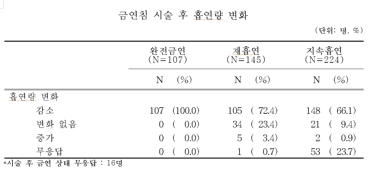 ‘흡연청소년 건강상담 및 금연침 무료시술사업’ 참여자들의 설문 결과에 의하면 2009년에는 73.7%, 2010년은 72.5%, 2011년 74.5%, 2013년 75.2% 등이 완전 금연 및 흡연량과 흡연욕구 감소 효과를 얻은 것으로 나타난 바 있다.