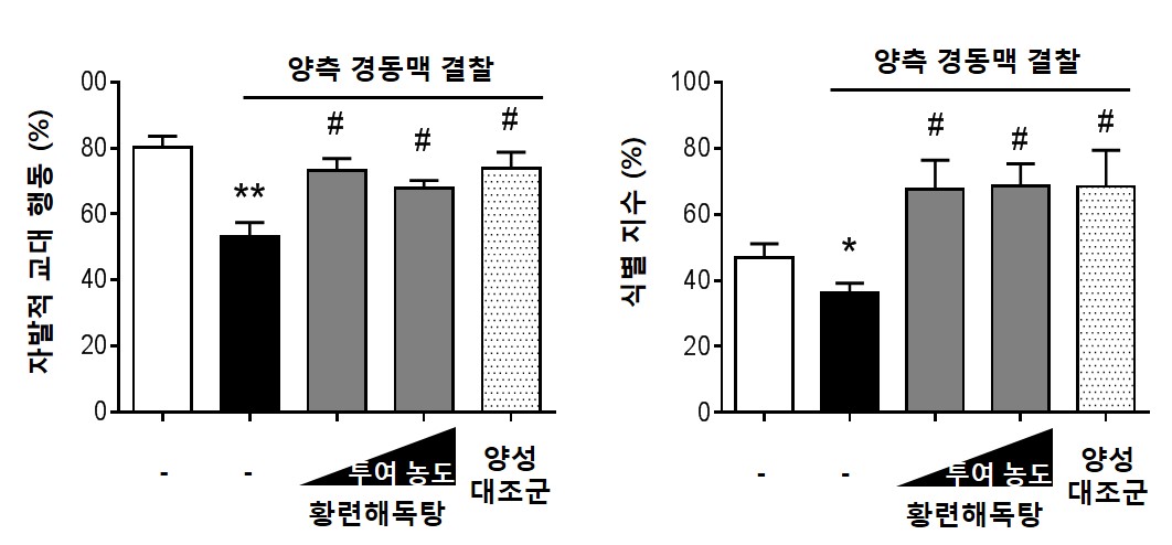 연구팀은 양측 경동맥 결찰로 유도한 혈관성 치매 모사 동물모델을 대상으로 황련해독탕을 투여했으며, 이후 이어진 Y-미로 시험에서 황련해독탕 추출물을 투여한 실험군의 행동비율이 대조군에 비해 20%까지 향상된 것을 확인했다.