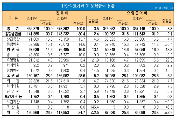 2012년 한의원의 건강보험진료비는 2011년 1조6548억원보다 5.9% 증가한 1조7522억원으로 전체 3.7% 점유했고, 한방병원의 경우에도 2012년 건보진료비는 전년도보다 14.5% 증가한 1800억원으로 나타났다.