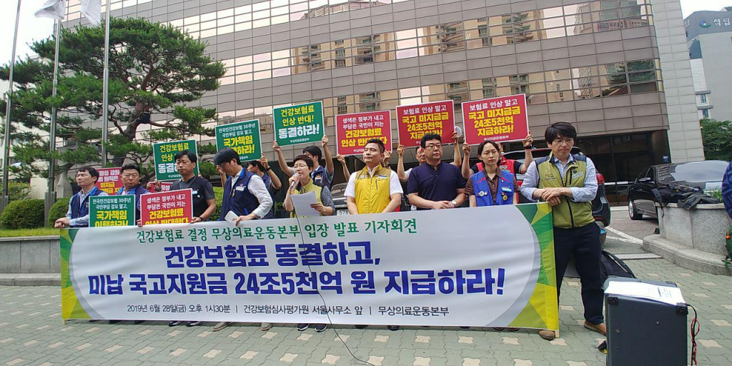 이날 건정심 개최에 앞서 의료민영화 저지와 무상의료 실현을 위한 운동본부(이하 운동본부)는 건정심이 개최되는 건강보험심사평가원 서울사무소 앞에서 기자회견을 개최, 건강보험료 동결과 함께 미납된 국고지원금 24조5000억원을 즉각 지급할 것을 촉구했다.