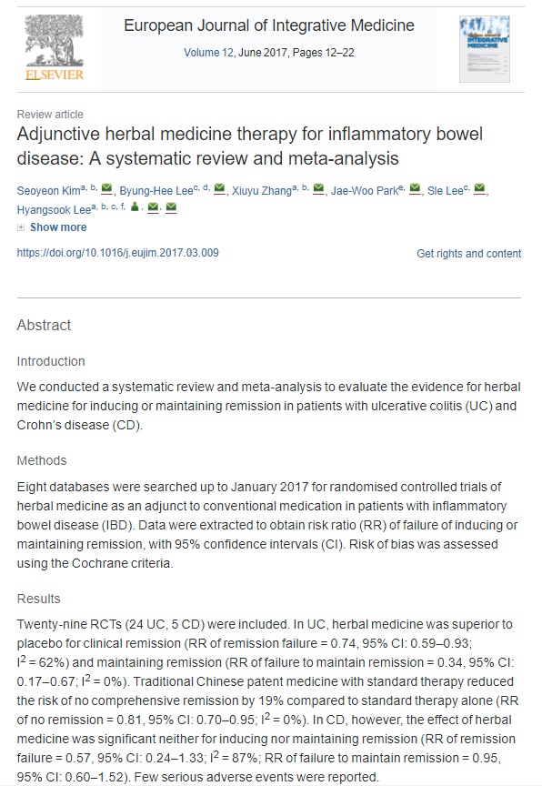 최근 SCI급 국제학술지인 유럽통합의학회지(European Journal of Integrative Medicine)에 게재된 '염증성 장질환에 대한 한약 치료의 효과에 관한 체계적 문헌 고찰(Systematic review) 및 메타 분석(Meta-analysis)' 논문(주저자 김서현 한의사 : 경희대학교 침구경락연구센터)에서는 2017년 1월까지 발표된 염증성 장질환 관련 논문 중 한약을 비롯한 천연물의 효과를 연구한 총 29편의 논문을 분석했다.