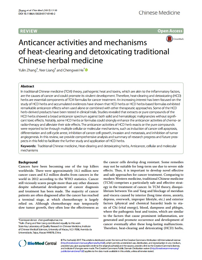 연구 결과에 따르면 HCD 약초 추출물 또는 화합물은 중대한 독성 영향 없이 고형 및 혈액학적 악성 종양에 대해 광범위한 항암 스펙트럼을 나타냈다. 특히, 일부 HCD 약초 및 제제는 화학 요법 또는 방사선 요법의 항암 작용을 강력하게 향상시키고 부작용을 완화했다. HCD 약초의 정확한 항암 활성이나 순수한 화합물은 암세포 ‘아폽토시스’의 유도, 분화 및 세포주기 정지, 암세포 성장 억제, 침입 및 전이, 종양 억제와 같은 여러 세포 또는 분자 메커니즘을 통해 이뤄진 것으로 보고됐다.