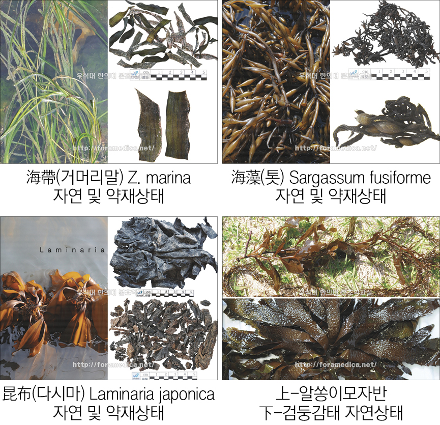 海藻는 馬尾藻科(모자반과; Sargassaceae)에 속한 알쏭이모자반(海蒿子, 大葉海藻) Sargassum pallidum (Turn.) C.Ag.(KHP, CP) 또는 톳(羊栖菜, 小葉海藻) S. fusiforme (Harv.) Setch.(KHP, CP)의 전초를 건조한 것으로, 여름과 가을에 바다 속에서 채취하여 잡질을 제거하고 담수로 씻은 다음 晒乾한다고 하였다. 하지만 이중 알쏭이모자반 역시 현재 채취금지 해양식물에 속한다.
