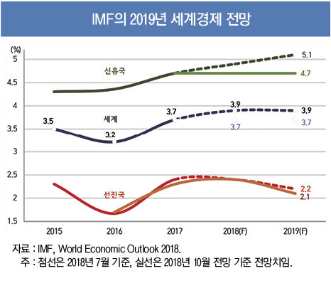 2018년 7월에는 IMF가 2018년 세계 경제성장률을 3.9%로 전망했고, 2019년에도 3.9% 수준의 성장세를 유지할 것이라고 보았다. 2018년과 2019년의 세계경제는 2011년 이후 가장 높은 수준을 유지하고 있는 수준이며, 2017년부터 이어온 경기 확장세가 지속되고 있다고 평가할 만하다. 그러나 2018년 10월 들어 2018년과 2019년 세계 경제성장률 전망치를 각각 3.7%로 하향조정했다. 즉, 2019년 세계경제는 ‘종전에 기대했던 만큼은 아니지만, 상당한 경기 확장세가 이어질 것’으로 전망된다.